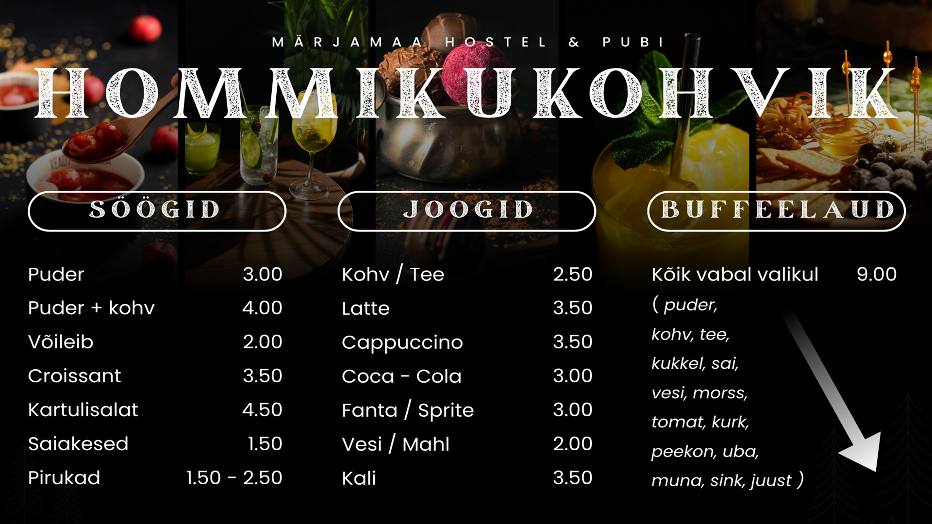 Rikkalik hommikusöök Märjamaa Hostel & Pubis – tööpäeviti kell 6:30–12:00. Ideaalne päev saab alguse mõnusast hommikusöögist. Pakume kõikidele klientidele nii majutavatele kui ka lihtsalt tulijatele rikkalikku hommikusööki. Alusta oma päeva buffet-hommikusöögiga või miks mitte ahjusoojade saiadega. Vaata täpsemalt meie menüüst.