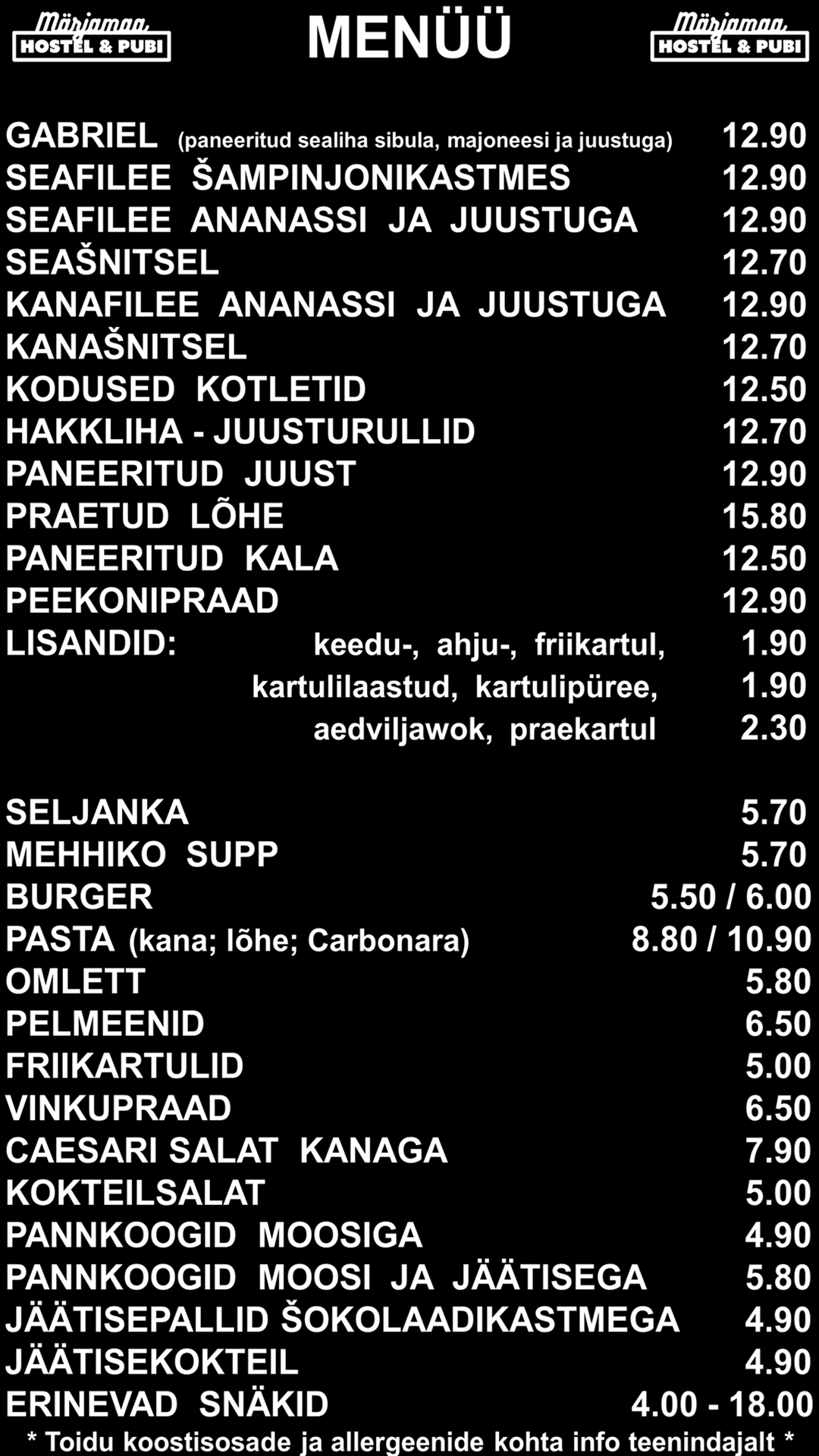 Märjamaa Hosteli Pubi – maitseelamused ja mõnus õhkkond igaks puhuks. Pakume värskel kohaliku toorainel põhinevat menüüd, päevapakkumisi ja õhtusööke. Pubi sobib suurepäraselt ka sünnipäevade ja firmapidude korraldamiseks. Kõige selle juures hoolitsevad meie professionaalsed teenindajad, et Sinu üritus kulgeks rõõmsalt, muretult ja sujuvalt. Sina ja Su külalised saate lihtsalt nautida – meie teeme ülejäänu. Jälgi meie lõunapakkumisi Facebookis.